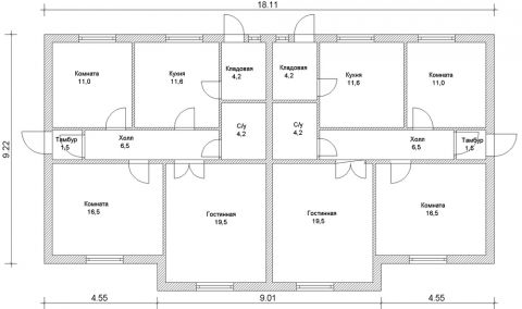Твинхаус «75+75» — это одноэтажный загородный дом, предназначенный для раздельного проживания одной большой или двух семей. Твинхаус разделен на две половинки капитальной стеной, при этом ничего не мешает объединить их.