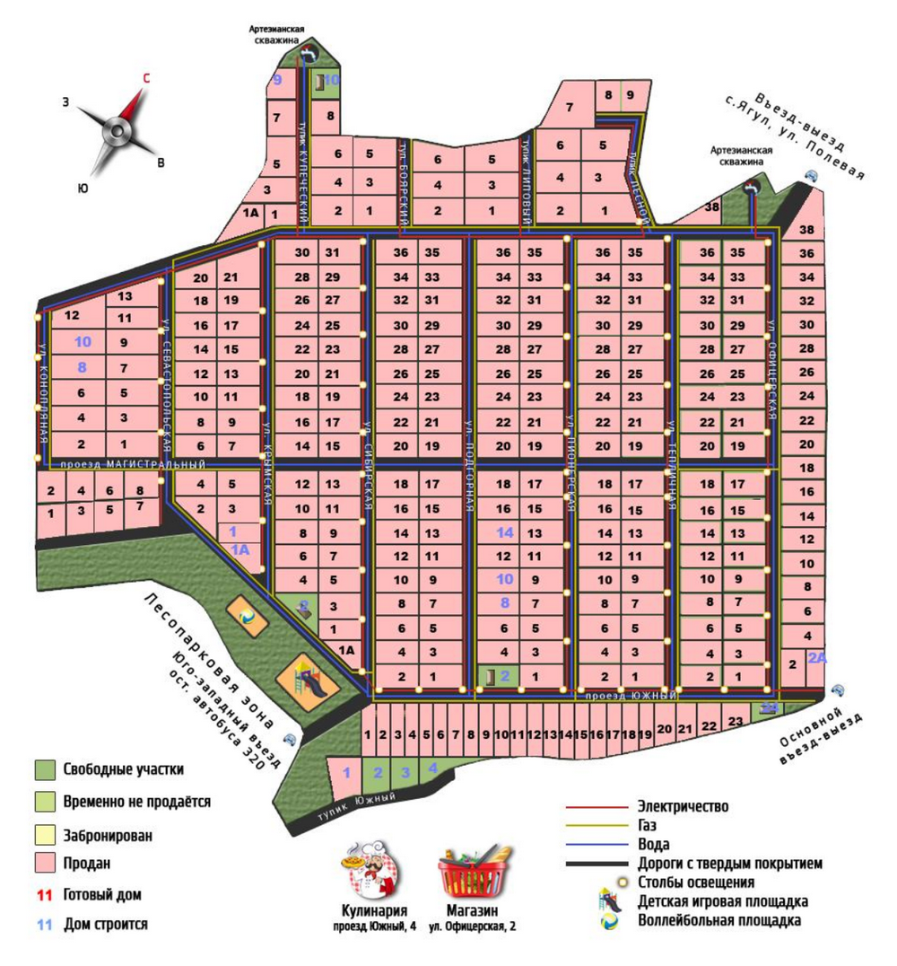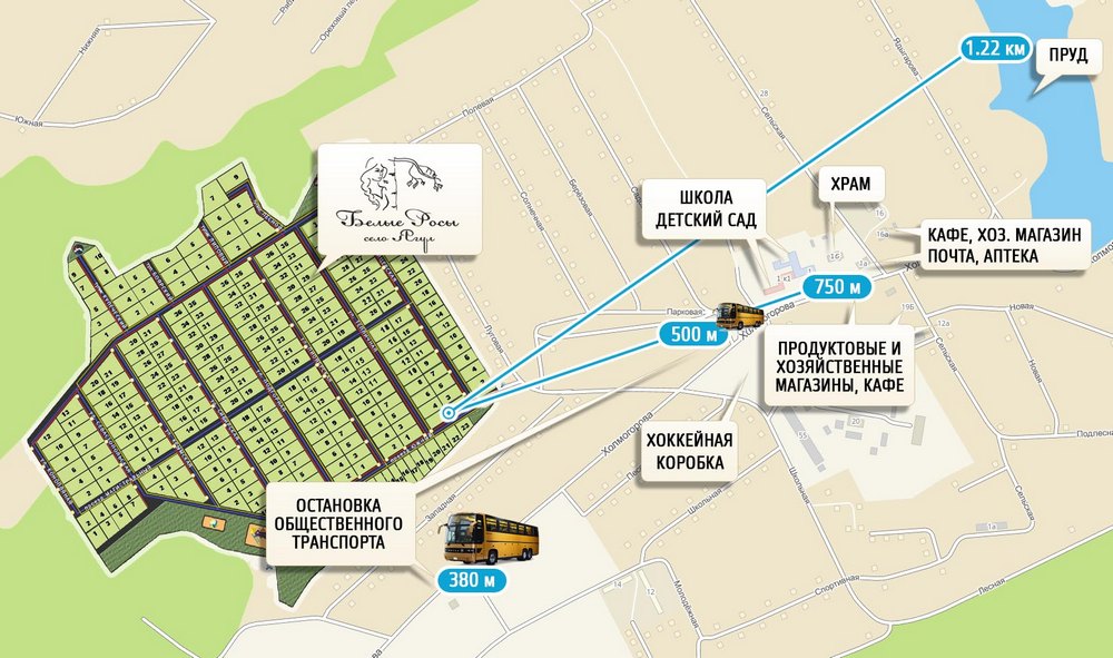 Общая площадь микрорайона — 3250 соток. Всего 287 участков от 9 до 19 соток.