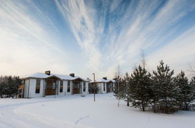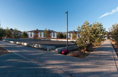 - На территории положили газон, посадили хвойные и лиственные деревья и кустарники, установили скамьи для пикника и отдыха из высококачественной террасной доски.