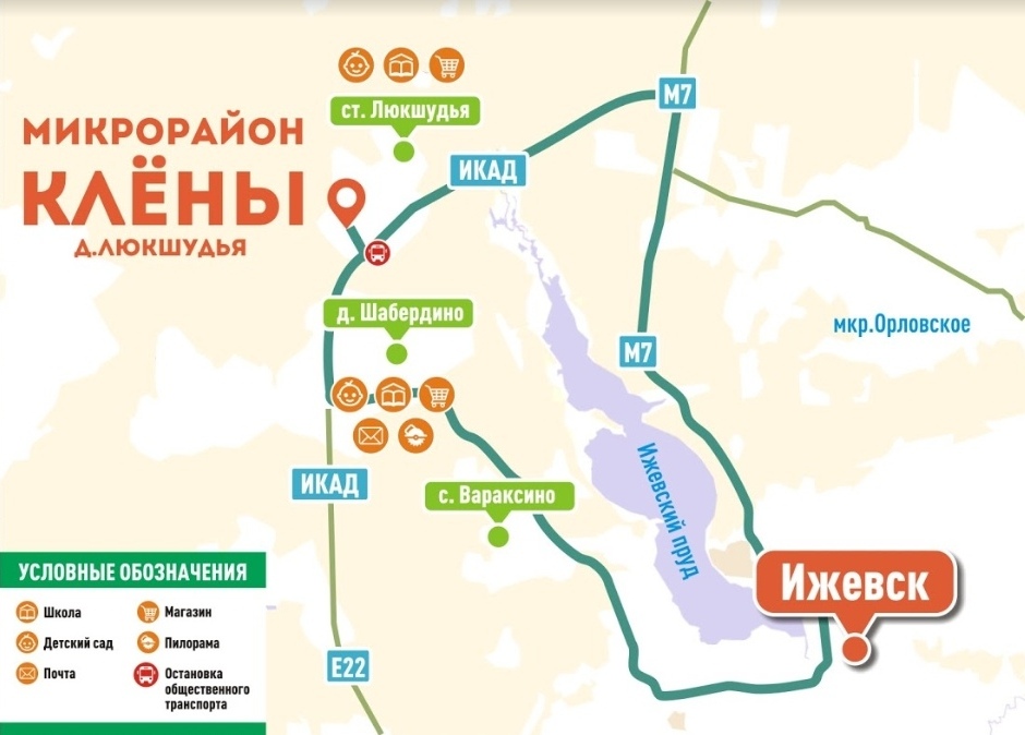 Микрорайон «Клены» находится в 15 км от Ижевска. Дорога по Як-Бодьинскому или Шабердинскому тракту займет около 20 минут. Общественный транспорт: автобусы 353, 363.