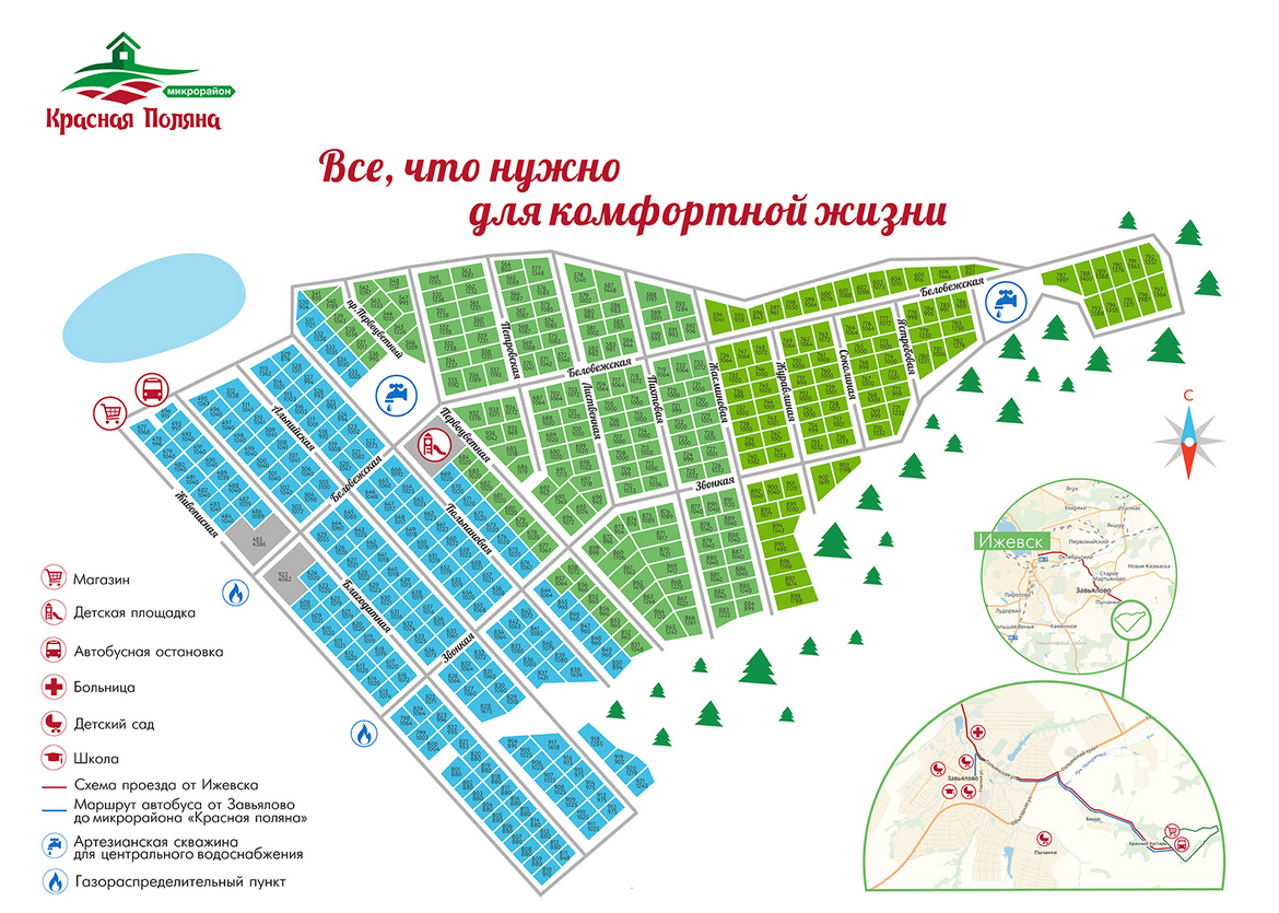 Микрорайон «Красная поляна» находится в 15 км от Ижевска около деревни Красный кустарь. В 5 км находится село Завьялово.